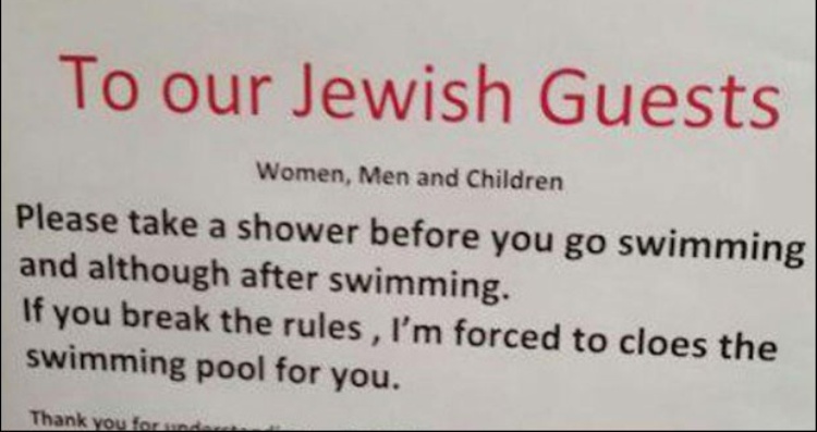 Naime, natpisom koji je postavljen se nalaže jevrejskim gostima da se tuširaju prije ulaska u bazen: "Za naše jevrejske goste, žene, muškarce i djecu, molimo vas da se istuširate prije ulaska u bazen. Ako prekršite propise, biću primoran da vam zabranim pristup bazenu".