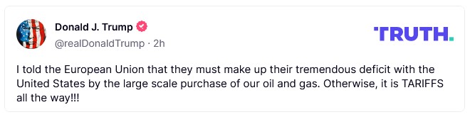 – Rekao sam EU da moraju da nadoknade svoj ogroman deficit sa SAD velikom kupovinom naše nafte i gasa. Inače ćemo uvesti carine! – napisao je Tramp na svojoj društvenoj mreži "Trut soušl".