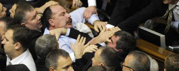Poslanici Svobode su se pridružili svom šefu na podijumu gdje se nalazi skupštinska govornica, a onda su se potukli sa poslanicima Partije regiona.