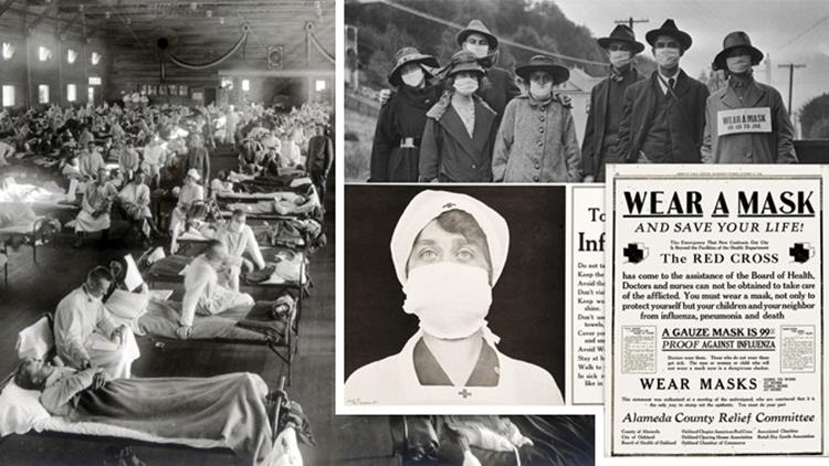 Током пандемије „шпанског грипа” озбиљне мере на државном нивоу подразумевале су затварање школа, позоришта и биоскопа, а строго се инсистирало на ношењу маски, чак и под паролом „носи маску или ћеш у затвор”. Тадашње маске су се мало разликовале од савремених, али изгледа да су биле маштовитије; популарне су биле и оне потпуно бескорисне које су покривале само нос, али и ексцентричне – за страсне пушаче, са специјалним отвором за „муштиклу”.