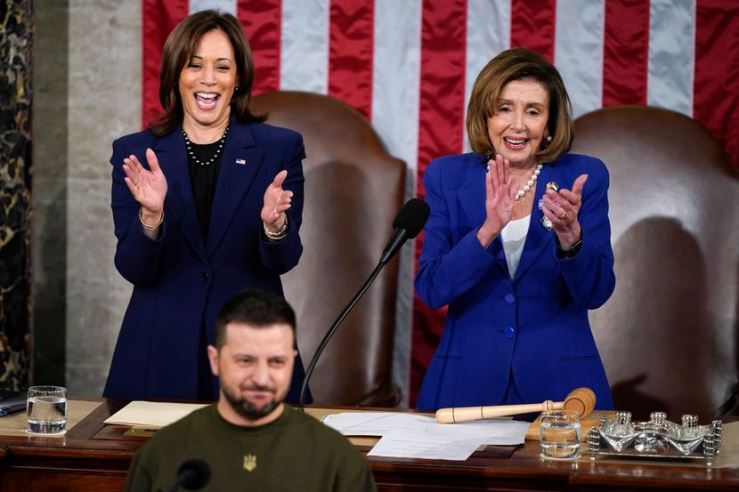 Predsjedavajuća Predstavničkog doma Nensi Pelosi i potpredsjednica Kamala Haris su je podigle.