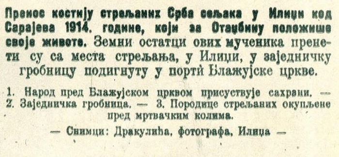 Прота Петар Лалић је прво одржао помен на мјесту стрељања, затим су посмртне остатке до Бање Илиџа пренијели преживјели “таоци интернирци” гдје је говор одржао секретар “Просвјете” Васиљ Грђић. Поворка креће ка Пландишту гдје је говор одржала Јока Шиљак, а онда добровољци уносе посмртне остатке у цркву гдје парастос држи миртополит Петар Зимоњић. Од цркве до гробнице остатке носе наизмјенично чланови ОРЈУНЕ (Организација југословенских националиста) и СРНАО (Српска национална омладина), да би их у гроб положили чланови породица.