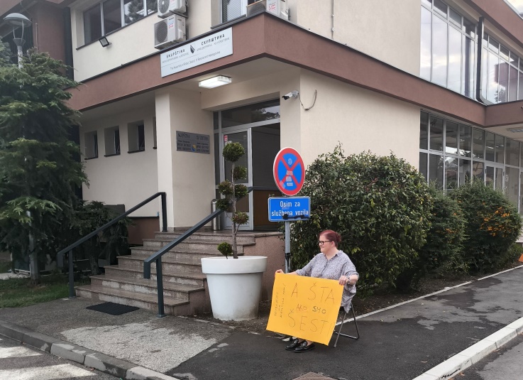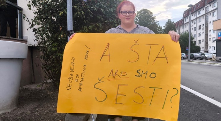 Na transparentu koji Kotur-Erkić drži piše "A šta ako smo šesti?"i traži se odgovor institucija na ograničenje po uspjehu na konkursu za osobe s invaliditetom koje su i bez ove odredbe u izuzetno teškom položaju na tržištu rada.