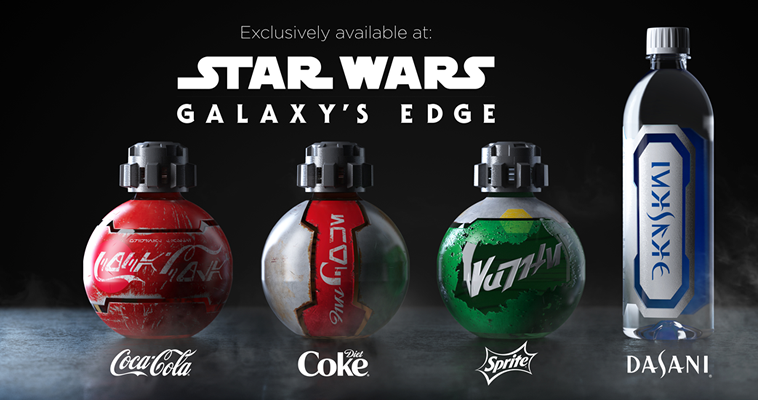 Coca-Cola je osmislila i dizajnirala posebne ambalaže svojih najpopularnijih pića koja će od 31. maja biti dostupna u tematskim parkovima Star Wars u Disneylandu u američkoj saveznoj državi Kaliforniji i Disney Worldu u gradu Orlando u američkoj saveznoj državi Floridi.