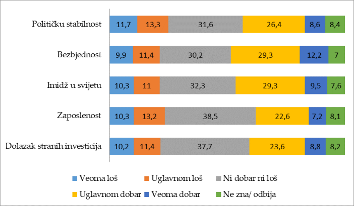 Trećina stanovnika (35%) smatra da će ulazak u NATO  povećati političku stabilnost u zemlji, dok 32,4% smatra da će to pozitivno uticati na privlačenje stranih ivesticija. Da će ulaskom u NATO savez doći do povećanja zaposlenosti smatra 29,8% stanovnika BiH.
