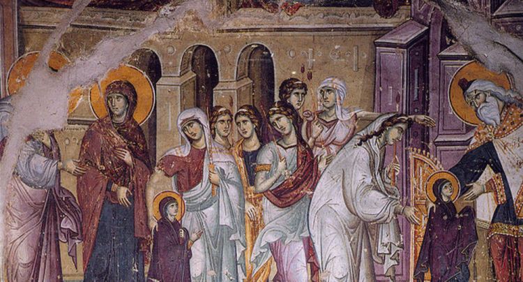 Marija je u skladu sa zavjetom roditelja Joakima i Ane – da će ako dobiju porod, dijete dati u hram – dovedena u Jerusalim i uvedena u hram.