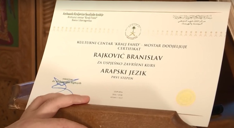 „Prvi susret sa arapskim jezikom, ustvari je susret sa živim ljudima. Ljudima Arapima, uglavnom ljudima iz Sirije. Jer arapski jezik se koristi u čuvenoj Antiohijskoj patrijaršiji i dan danas. Dakle, sva bogosluženja crvke su na arpaskom jeziku. Međutim, ovdje u kulturnom centru u Mostaru to dobiva još jednu dimenziju, jer ja arapski ustvari učim od muslimana. I sa arapskim jezikom upoznajem se i sa jednom islamskom kulturom, ustvari.“, priča Branislav.