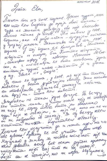 Pišem ti iz 2018. godine. Nekim čudom, ali kao što ćeš videti do kraja ovog pisma – čuda se zaista dešavaju, ovo moje blesavo pismo stiže do tebe. Ti živiš u 1998. godini, ako se dobro sećam – predaješ engleski jezik u srednjoj školi. Zanimljiva ti je ta 1998. godina. U toj godini će Kameronov Titanik osvojiti 11 oskara, Bil Klinton uporno negirati saksofon aferu sa izvesnom Monikom Levinski a 04. septembra će biti osnovana jedna kompanija čudnog imena, zapamti je i uloži u nju. Zvaće se Google.