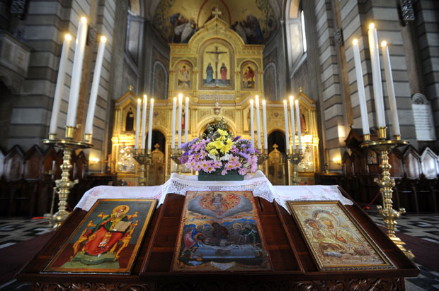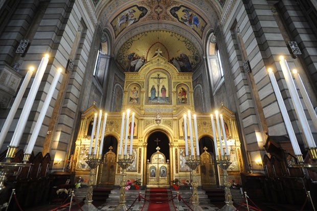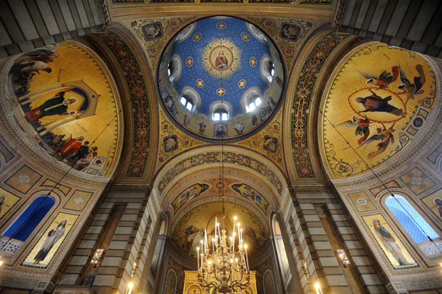 Унутрашњост храма плијени посјетиоце величанственошћу византијске умјетности – на централној куполи приказан је Христос Пантократор на звјезданом небу, у тамбуру куполе Исус је насликан на пријестолу окружен светитељима, посебно се истиче велико сребрно кандило, поклон руског цара Павла Првог Романова, док је руска кнегиња Јулија Самојлова даровала храму златом оковано Јеванђеље.