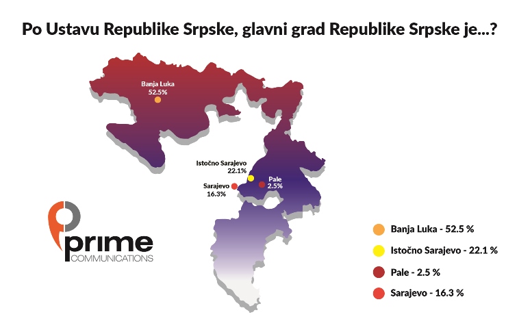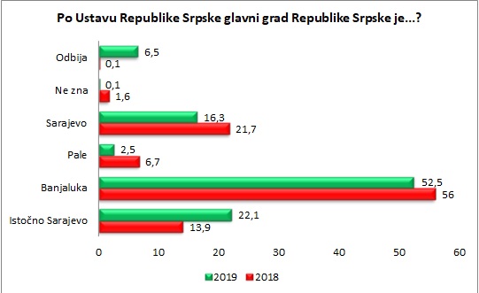 Da je po Ustavu Republike Srpske njen glavni grad Banjaluka 2018. godine je tvrdilo 56% stanovnika Republike Srpske, a 2019. godine taj rezultat je 52,5%.