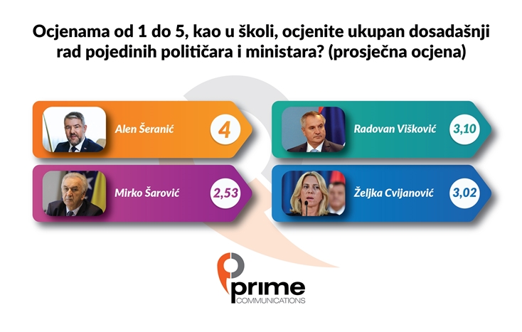 Kada pogledamo prosječne ocjene rada domaćih političara vidimo da je najveću ocjenu dobio ministar Alen Šerenić (4), a slijede premijer Radovan Višković (3,10), Željka Cvijanović (3,02) i Mirko Šarović (2,53).