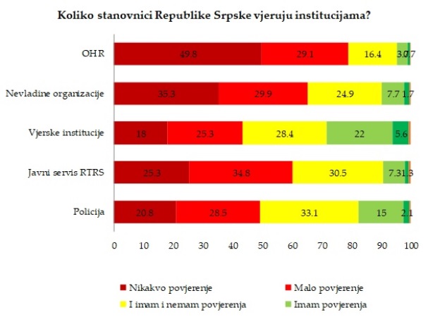 Istraživanje je pokazalo da stanovnici Republike Srpske najviše vjeruju vjerskim organizacijama (27,6%), policiji (17,1%), nevladinim organizacijama (9,4%),  javnom servisu Republike Srpske (8,6%) i OHR-u  (4,4%).