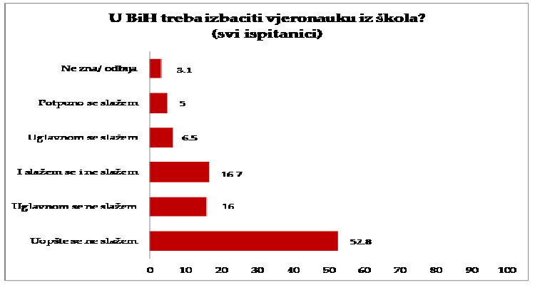 Ako pogledamo odgovore svih ispitanika vidimo da se 52,8% njih uopšte ne slaže da se vjeronauka izbaci iz škola, dok se 16% uglavnom ne slaže. Nedoumice oko statusa vjeronauke u školama ima 16,7% ispitanika, dok 11,5% podržava ovu ideju.