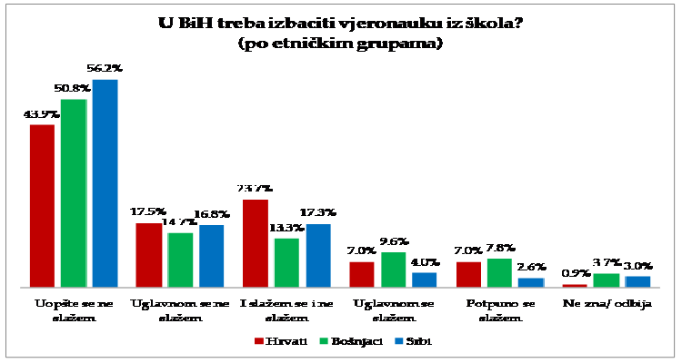 Kada odgovore podijelimo po etničkoj pripadnosti vidimo da se ukidanju vjeronauke najviše protive Srbi (73%), potom Bošnjaci (65,5%) i najmanje Hrvati (61,4%). Ipak među Hrvatima nalazimo najveći procenat (23,7%) onih koji su još uvijek u nedoumici, kao i 17,3% Srba i 13,3% Bošnjaka. Podršku ukidanju vjeronauke u školama pruža 17,4% Bošnjaka, 14% Hrvata i 6,6% Srba.