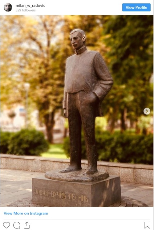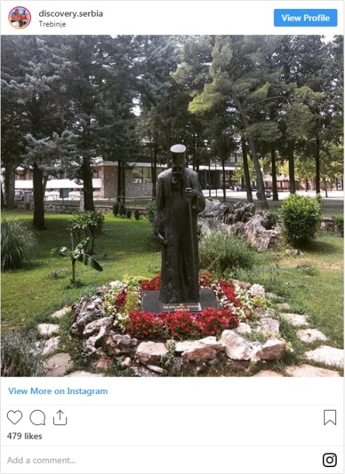 Naspram njeovog spomenika nalazi se spomenik Petru II Petroviću Njegošu. Pošto Trebinjci odmaraju u toku dana i ulice budu prazne, postoji legenda koja kaže da dva velikana svakog dana u to vreme jedan drugom govore stihove.