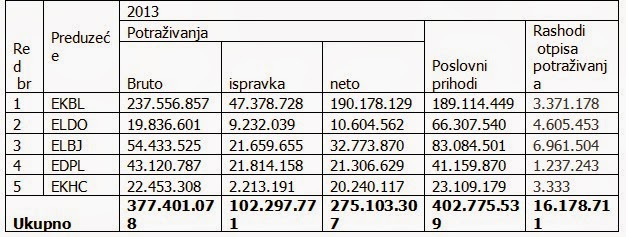 Prema podacima iz finansijskih izvještaja distributivnih preduzeća za 2013. godinu vidljivo je da ispravka vrijednosti potraživanja u bilansima stanja iznose 102 miliona KM, a da rashodi po osnovu ispravke vrijednosti potraživanja za 2013. iznose oko 16 miliona KM i na taj način direktno utiču na finansijski rezultat. U narednoj tabeli prikazana su bruto i neto potraživanja po distributivnim preduzećima zajedno sa visinom ispravke vrijednosti, prihodima i troškovima otpisa potraživanja za 2013.godinu:
