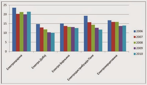Sledeći grafikon prikazuje distributivne gubitke gde se vidi da se najveće krađe unutar distributivnih preduzeća dešavaju u Elektrokrajini a.d. Banja Luka.