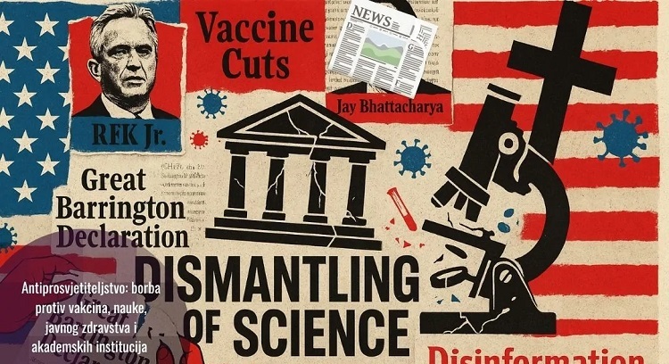 Antinaučni narativ koji se njeguje uporedo sa svim mogućim teorijama zavjera, alternativnom medicinom, šamanizmom, sirovom hranom sirovim mlijekom, protivljenju evoluciji kao naučnom faktu, vakcinama, sada cvjeta. Režim gura okvir fundamentalističkog kršćanstva, eugenike, fašizma, tamnog prosvjetiteljstva, tehnokratskog feudalizma i despotstva, čistoće rase (kampanje Sydney Sweeney u kojoj ona ima blue jeans/genes) te bjesomučnog razmnožavanja, tretirajući žene tek kao organizam koji rađa radnu i vojnu snagu. U ovoj, kako bi Phillip Roth rekao, zavjeri protiv Amerike, ključni neprijatelji su naučna pismenost, pismenost uopšte, nauka, naučnici, akademska zajednica pa onda i svi pstali koji su u điru ljudskih prava i sloboda.