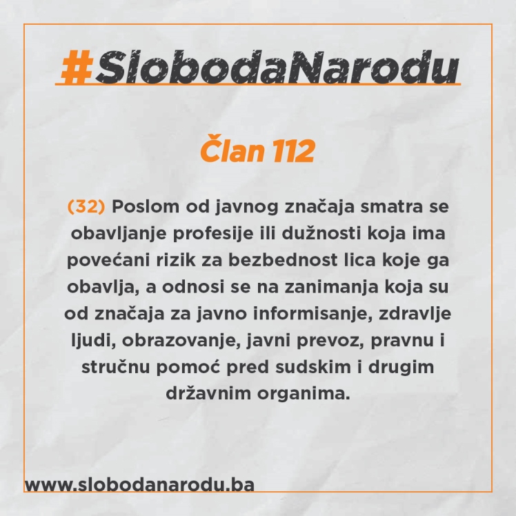 “Na osnovu člana 8 Poslovnika Predstavničkog doma Parlamentarne skupštine Bosne i Hercegovine, podnosim poslaničku inicijativu kojom se sugerira nadležnim entitetskim institucijama, odnosno institucijama Brčko Distrikta (vlade i zakonodavna tijela) da pripreme i usvoje izmjene i dopune zakona o zaštiti od klevete, na način da se u njih inkorporiraju različiti standardi prihvatljivosti, tolerancije te dokazivanja kada je u pitanju navodna kleveta protiv javnih ličnosti u odnosu na privatne osobe, a u skladu sa sudskom praksom Evropskog suda za ljudska prava”.