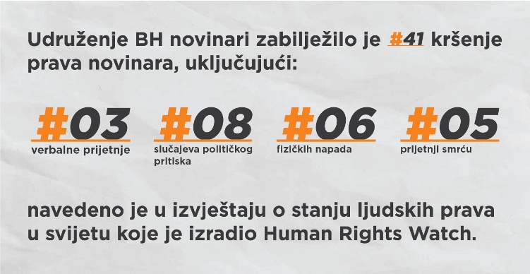 Od augusta 2019. godine do polovine januara 2020. godine, Udruženje BH novinari zabilježilo je 41 kršenje prava novinara, uključujući tri verbalne prijetnje, osam slučajeva političkog pritiska, šest fizičkih napada i pet prijetnji smrću, navedeno je u izvještaju o stanju ljudskih prava u svijetu koje je izradio Human Rights Watch. Većina slučajeva napada i prijetnji novinarima prijavljena je policiji, a u trenutku pisanja izvještaja (januar 2020), 15 slučajeva je upućeno nadležnim tužilaštvima.