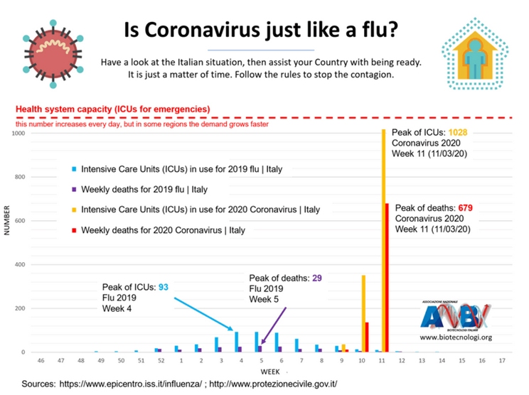 Konačno grafikon koji je nedavno objavilo Talijansko udruženje biotehničara (pogledajte dole) jasno pokazuje da je broj oboljelih i umrlih od koronavirusa mnogostruko veći od brojeva u epidemiji sezonske gripe 2018./2019. To se nikako ne može zamijeniti s uobičajenim stanjem za vrijeme sezonske gripe i prehlada.