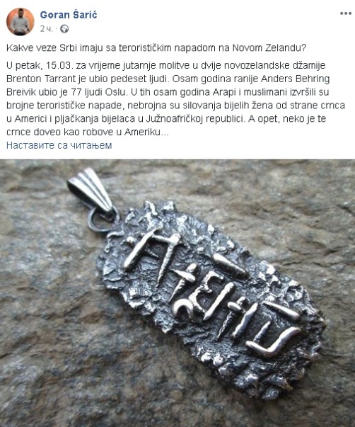 "U petak, 15.03. za vrijeme jutarnje molitve u dvije novozelandske džamije Brenton Tarrant je ubio pedeset ljudi. Osam godina ranije Anders Behring Breivik ubio je 77 ljudi Oslu. U tih osam godina Arapi i muslimani izvršili su brojne terorističke napade, nebrojna su silovanja bijelih žena od strane crnca u Americi i pljačkanja bijelaca u Južnoafričkoj republici. A opet, neko je te crnce doveo kao robove u Ameriku, neko je kolonizirao Južnu Afriku i izvršio agresiju na Afganistan, Irak i Libiju.