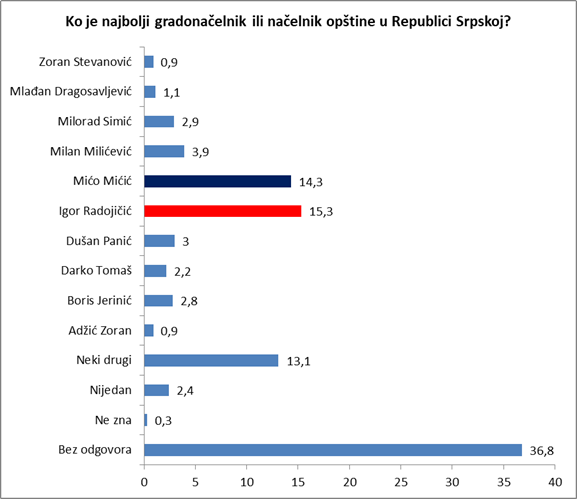 Važno je napomenuti da su ispitanici imali mogućnost da spomenu ime bilo kojeg gradonačelnika/ načelnika opštine ili grada u Republici Srpskoj bez obzira gdje žive. Takođe, važno je naglasiti da je uzorak u gradu Banjaluci bio veći za 60 ispitanika u odnosu na Bijeljinu.