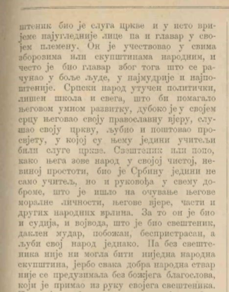 "…Свештеник био је слуга Цркве и у исто вријеме најугледније лице, па и главар у својем племену. Он је учествовао у свима зборовима или скупштинама народним, и често је био главар због тога што се рачунао у боље људе, у најмудрије и најпоштеније", писао је у тексту.