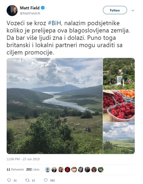 "Vozeći se kroz BiH, nalazim podsjetnike koliko je prelijepa ova blagoslovljena zemlja. Da bar više ljudi zna i dolazi. Puno toga britanski i lokalni partneri mogu uraditi sa ciljem promocije", napisao je Fild na svom Tviter profilu.