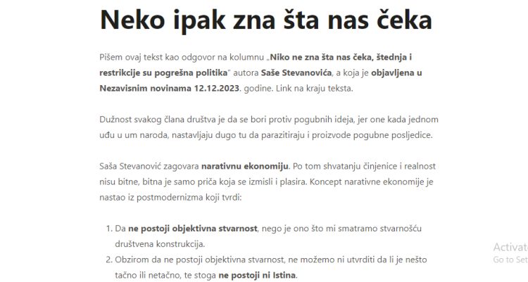 Naizad, kao još jedno čedo postmodernizma imamo narativnu ekonomiju. Nikakve činjenice nisu bitne, bitna je samo priča koja se priča i kao takva utiče na ponašanje pojedinaca koji donose ekonomske odluke. Ako to prevedemo na prost jezik, vidjećemo zašto je ova ideologija primamljiva elitama, upravo jer tvrdi da: Laganje o objektivnoj stvarnosti dovodi do ekonomskog rasta.