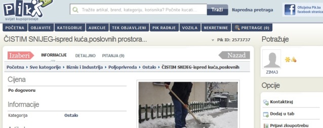 На порталу за купопродају Пик.ба данас се појавио необичан оглас којим се нуди услуга чишћења снијега испред кућа, пословних простора и сл. Није познато ко је особа која је оглас поставила, јер на огласу стоји само име Зима3.
