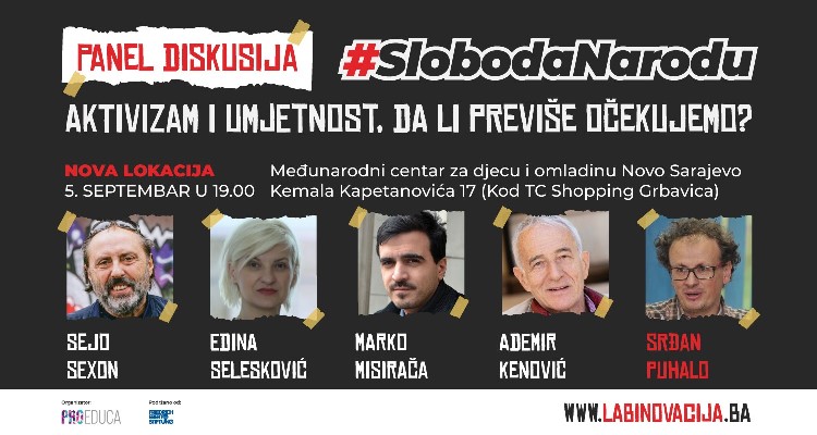Panel diskusija „Aktivizam i umjetnost-da li previše očekujemo?“ će se održati sutra, 5. septembra, sa početkom u 19 časova u Međunarodnom centru za djecu i omladinu Novo Sarajevo.