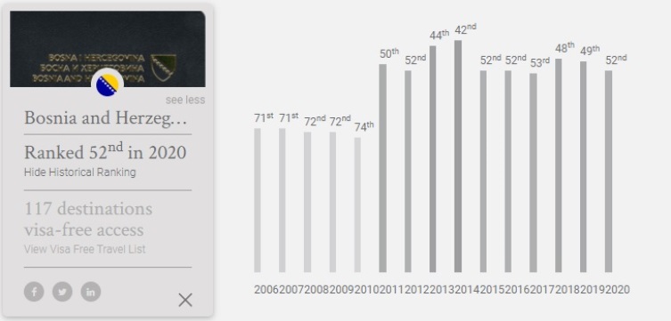 Bosna i Hercegovina je zabilježila pad na ljestvici najmoćnijih pasoša, s obzirom da se u 2019. godini nalazila na 49. mjestu. BiH je njabolje bila rangirana 2014. godine kada je zauzimala 42. mjesto. U 2018. godini BiH je bila na 48. mjestu.