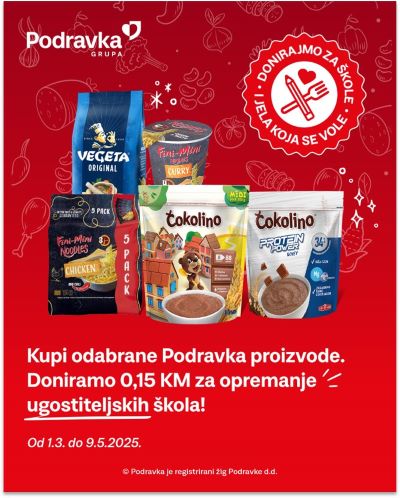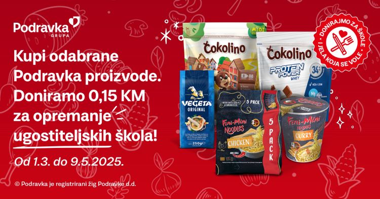 Ove godine, u sklopu projekta "Donirajmo za škole i jela koja se vole", Podravka je svim srednjim ugostiteljskim školama u BiH, njih ukupno 33, uručila poklon pakete svojih proizvoda ukupne tržišne vrijednosti 16.500 KM te će ponovo osigurati donacije za obnovu kabineta praktične nastave za šest srednjih ugostiteljskih škola. Ovaj društveno odgovorni projekat traje od 1.3. do 9.5.2025. godine, a tokom tog perioda, dio dobiti od kupovine Podravkinih proizvoda bit će izdvojen za podršku ugostiteljskim školama. Prikupljena sredstva namijenjena su za nabavu i obnovu opreme u kabinetima praktične nastave, čime će se unaprijediti obrazovni proces za buduće kuhare i ugostiteljske stručnjake.