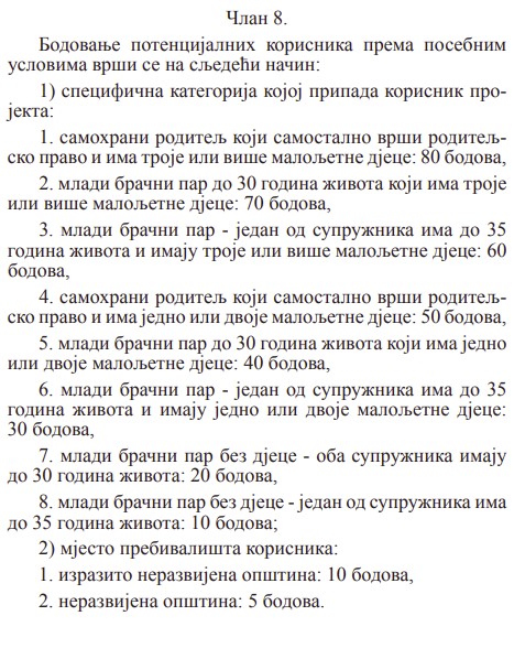 Po onome što se vidi iz nedavno objavljenog pravilnika, najveće šanse za stambenu jedinicu imaće samohrani roditelji sa troje ili više djece (80 bodova) koji žive u izrazito nerazvijenoj opštini (10 bodova).