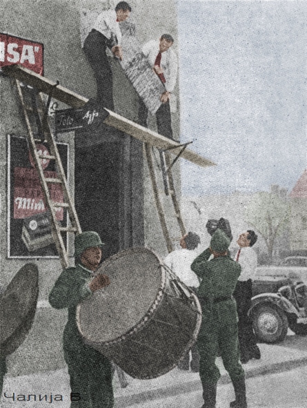 Фолксдојчери скидају таблу с мјеста атентата, коју ће касније Хитлер добити за рођендан