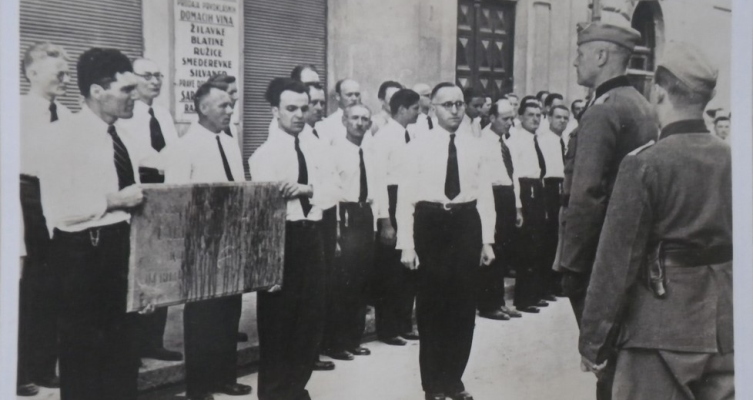 Фолксдојчери скидају таблу с мјеста атентата, коју ће касније Хитлер добити за рођендан