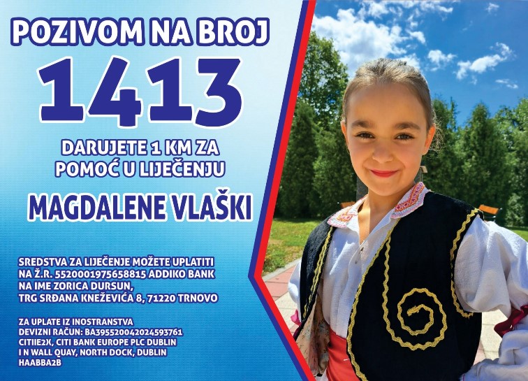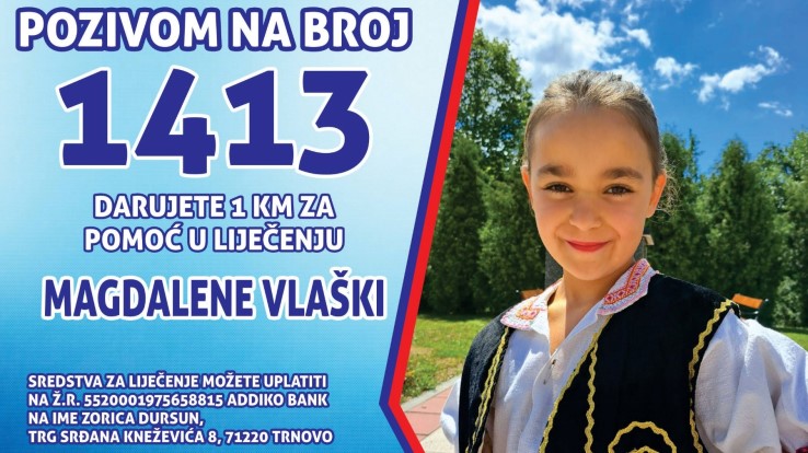 У мрежи МТЕЛ је отворен хуманитарни број 1413 који ће бити активан током мјесеца априла и на који позивом можете даровати 1КМ за Магдаленино лијечење у иностранству.
