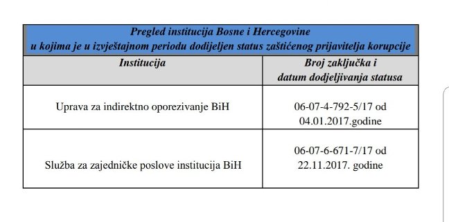 Tokom prošle godine bh. građani su 130 puta prijavili korupciju Agenciji za prevenciju korupcije i koordinaciju borbe protiv korupcije (APIK). Od ukupnog broja prijava u 63% slučaja poznat je identitet prijavitelja, dok je anonimnih prijava 37% . Prema godišnjem izvještaju APIK-a, zabilježen je porast anonimnog prijavljivanja korupcije iz straha za gubitak radnog mjesta ili represije koju bi mogli trpiti prijavitelji ili njihova porodica. Agencija je dobila četiri zahtjeva za dodjelu statusa zaštićenog prijavitelja korupcije, te je nakon analize slučajeva odlučila da dvije osobe dobiju taj status.