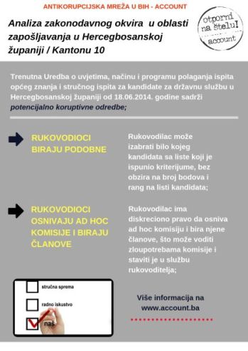 Helsinški odbor za ljudska prava je analizirao zakonodavni okvir u sedam kantona u BiH (BPK, TK, ZDK, USK, Posavki kanton). Rezultati za Kanton 10 između ostalog pokazuju da Uredba o uslovima, načinu i programu polaganja ispita opšteg znanja i stručnog ispita za kandidate za državnu službu u Hercegbosanskoj županiji sadrži potencijalno koruptivne odredbe, budući da