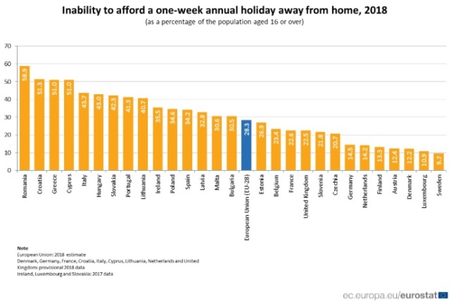Među 28 država članica EU, zemlje s najvećim postotkom čiji građani ne mogu priuštiti godišnji odmor su Rumunija (58,9%), Hrvatska (51,3%), Grčka (51%) i Kipar (51,0%).