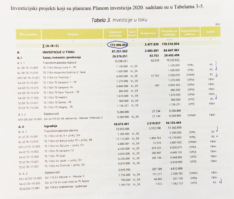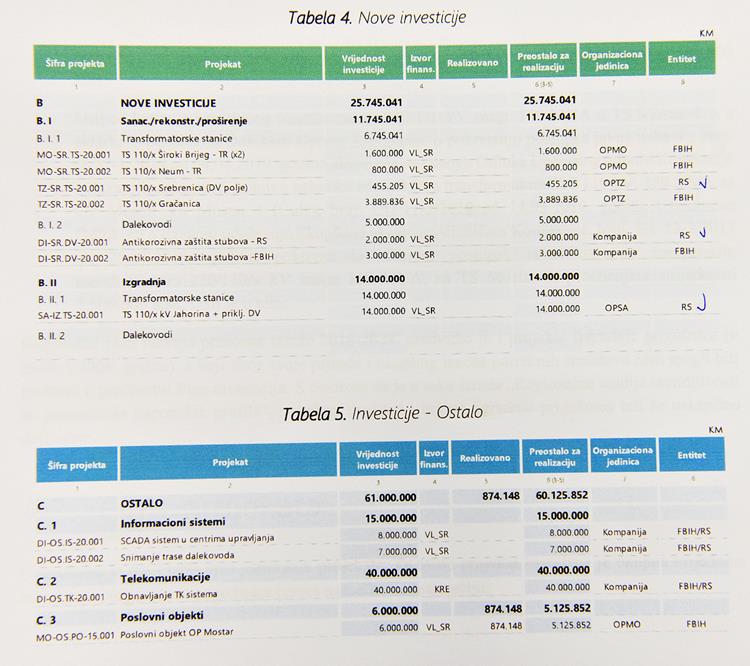 Планом инвестиција за 2020. годину предвиђене су инвестиције вриједности 173.996.693 КМ, од чега ће 42 одсто бити реализовано у Републици Српској, односно око 70 милиона КМ.