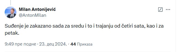 Suđenje je zakazano sada za srijedu i to i trajanju od četiri sata, kao i za petak, dodao je Antonijević