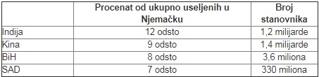 Prema ovim podacima, od ukupno 266.000 novouseljenih u Njemačku izvan zemalja EU tokom 2018. godine, 12 odsto otpada na Indijce, devet na Kineze, osam na bh. građane, a sedam odsto na Amerikance.