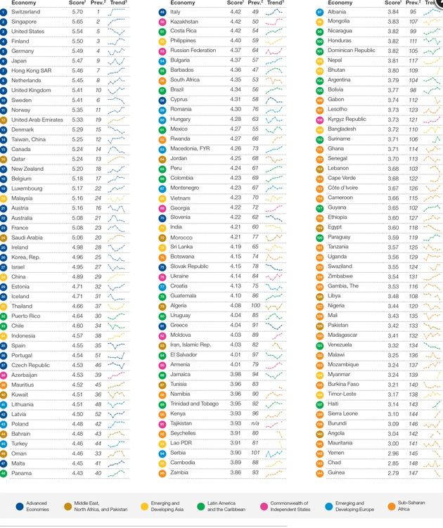 Nakon što je prošle godine napredovala s 81. na 75. mjesto, na novoj je listi Hrvatska skliznula na 77. mjesto, s prosječnom ocjenom od 4,13, kao i prošle godine. Poređenja radi, Švicarska, kao najkonkurentnija, dobila je prosječnu ocjenu 5,70 od ukupno sedam.