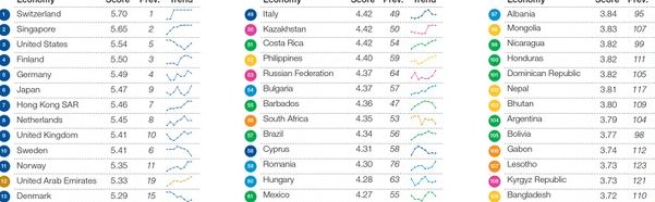 Potom slijedi Singapur, dok su se na treće mjesto probile Sjedinjene Američke Države, koje su prošle godine bile na 5. mjestu. Finska je pala s 3. na 4. mjesto, a slijedi Njemačka, koja je s 4. došla na 5. mjesta. Japan je napredovao tri mjesta i nalazi se na 6. poziciji. Hong Kong je zadržao 7., a Holandija 8. mjesto, dok je Velika Britanija napredovala za jedno mjesto i sada je 9. poziciji. Švedska je nazadovala za četiri mjesta i sada se nalazi na 10. mjestu.