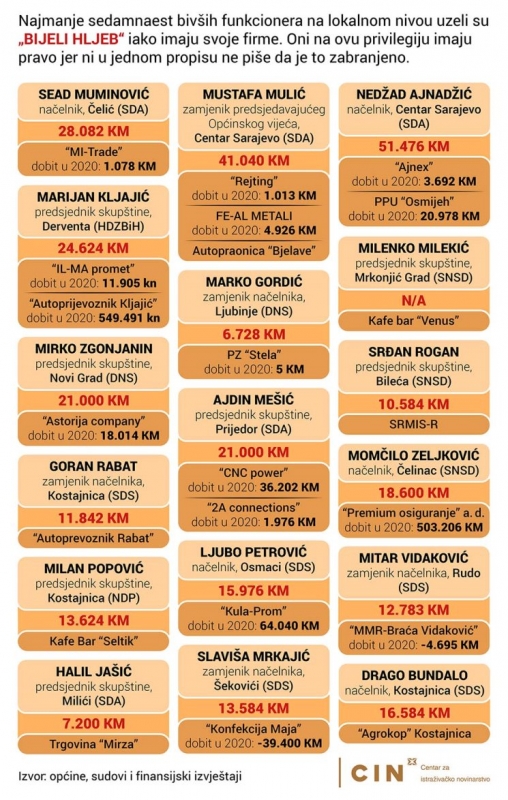 Ukupno 22 funkcionera koji su po isteku prošlog mandata tražili „bijeli hljeb“ osvojili su na Lokalnim izborima 2020 nove mandate. To im nije smetalo da uživaju u privilegiji „bijelog hljeba“ jer odbornici/vijećnici nisu zaposleni u općinskim vijećima i skupštinama, ali primaju mjesečne naknade do 500 KM. Za razliku od njih, predsjednici i potpredsjednici imaju status zaposlenih lica pa moraju birati između naknade na novoj poziciji i „bijelog hljeba“ sa stare funkcije.