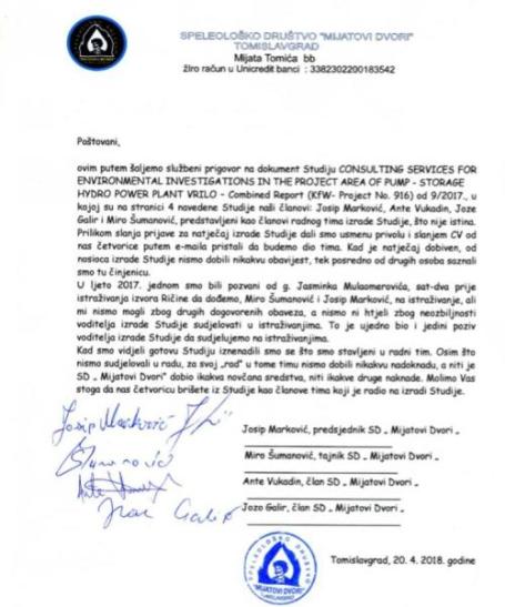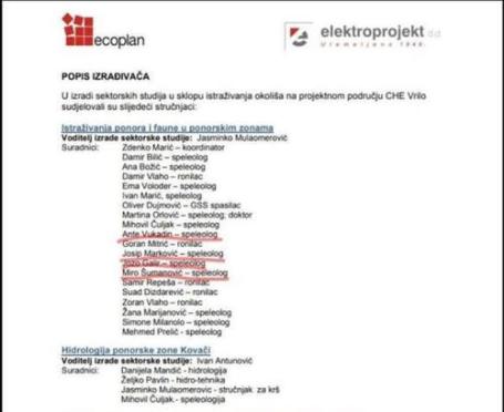 Svi navedeni stručnjaci su članovi Speleološkog društva "Mijatovi dvori"  iz Tomislavgrada koji su poslali službeni prigovor na dokument “Studija uticaja na okoliš”, sa zahtjevom da se pomenuta četiri speleologa izbrišu iz studije u čijoj izradi, kako tvrde, nisu učestvovali. Kako se navodi u prigovoru, Josip Marković, Ante Vukadin, Joze Galir i Miro Šumanović predstavljeni su kao članovi radnog tima za izradu studije, što nije istina.
