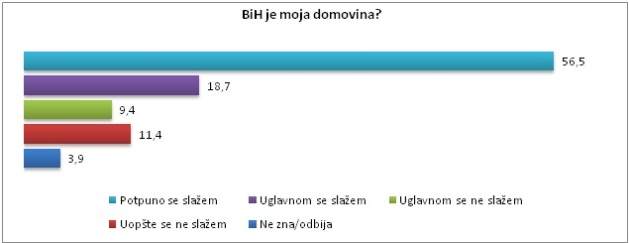 Više od polovine ispitanika u potpunosti se složilo sa tvrdnjom „BiH je moja domovina“, njih 56,5%, a uglavnom se slaže njih 18,7%, što ukupno čini 75,2% ispitanika koji se potpuno ili uglavnom slažu sa konstatacijom da je Bosna i Hercegovina njihova domovina.