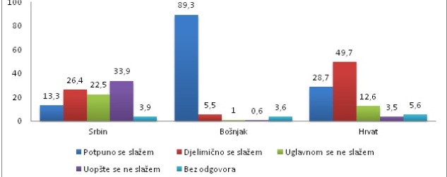 Sa tvrdnjom “BiH je moja domovina?” u potpunosti slaže 89,3% Bošnjaka, 28,7% Hrvata i 13,3% Srba, dok se sa ovom tvrdnjom uglavnom slaže 49,7% Hrvata, 26,4% Srba i 5,5% Bošnjaka.